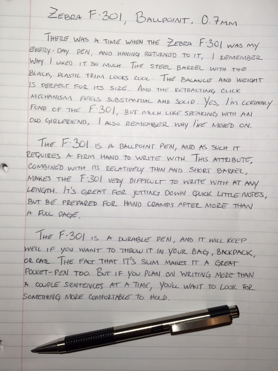 There was a time when the Zebra F-301 was my every-day pen, and having returned to it, I remember why I liked it so much. The steel barrel with the black, plastic trim looks cool. The balance and weight is perfect for its size. And the retracting click mechanism feels substantial and solid. Yes, I’m certainly fond of the F-301, but much like speaking with an old girlfriend, I also remember why I’ve moved on.