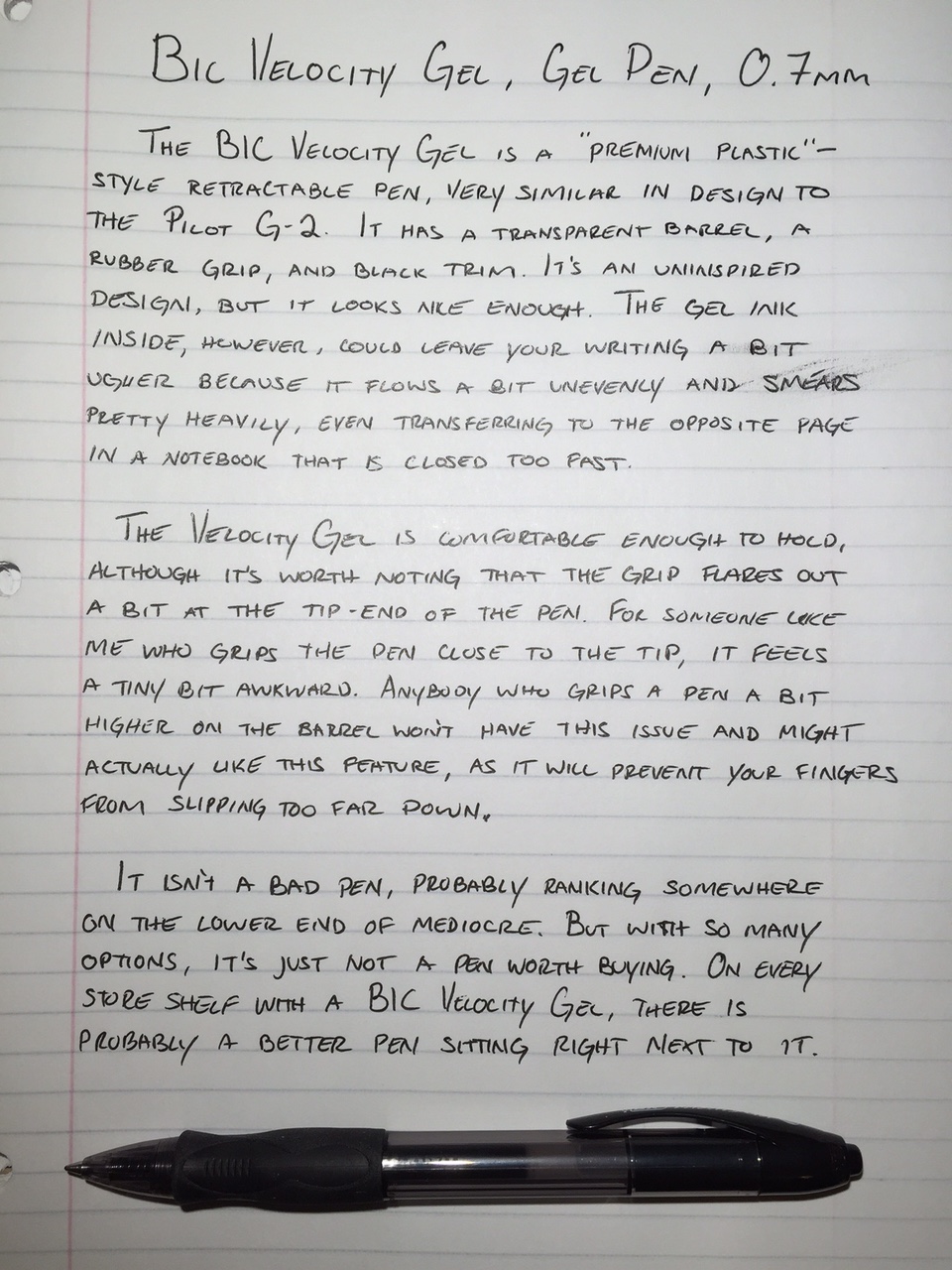 It isn’t a bad pen, probably ranking somewhere on the lower end of mediocre. But with so many options, it’s just not a pen worth buying. On every store shelf with a BIC Velocity Gel, there is probably a better pen sitting right next to it.