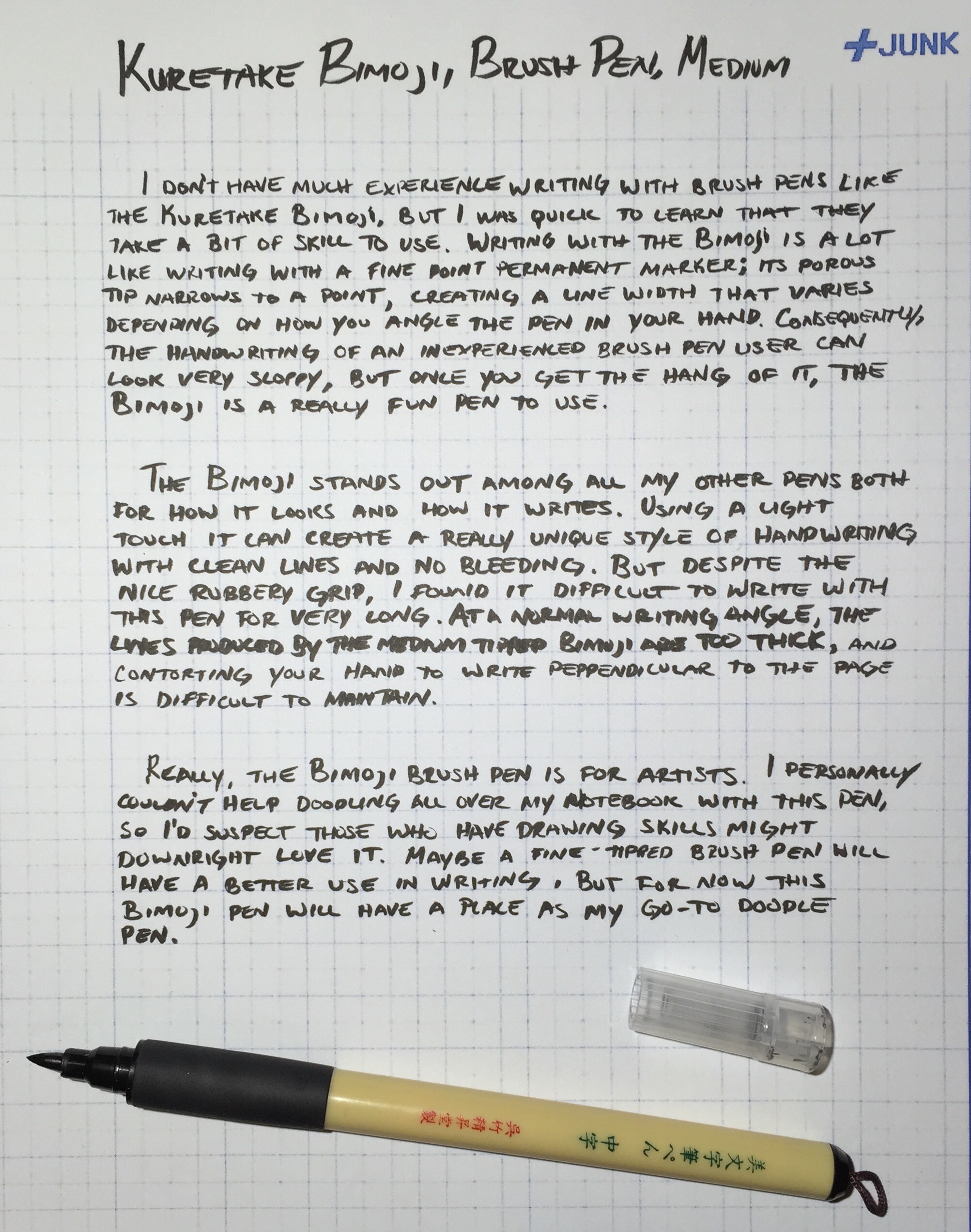 I don’t have much experience writing with brush pens like the Kuretake Bimoji, but I was quick to learn that they take a bit of skill to use. Writing with the Bimoji is a lot like writing with a fine-point permanent marker; its porous tip narrows to a point, creating a line width that varies depending on how you angle the pen in your hand. Consequently, the handwriting of an inexperienced brush pen user can look very sloppy, but once you got the hang of it, the Bimoji is a really fun pen to use.