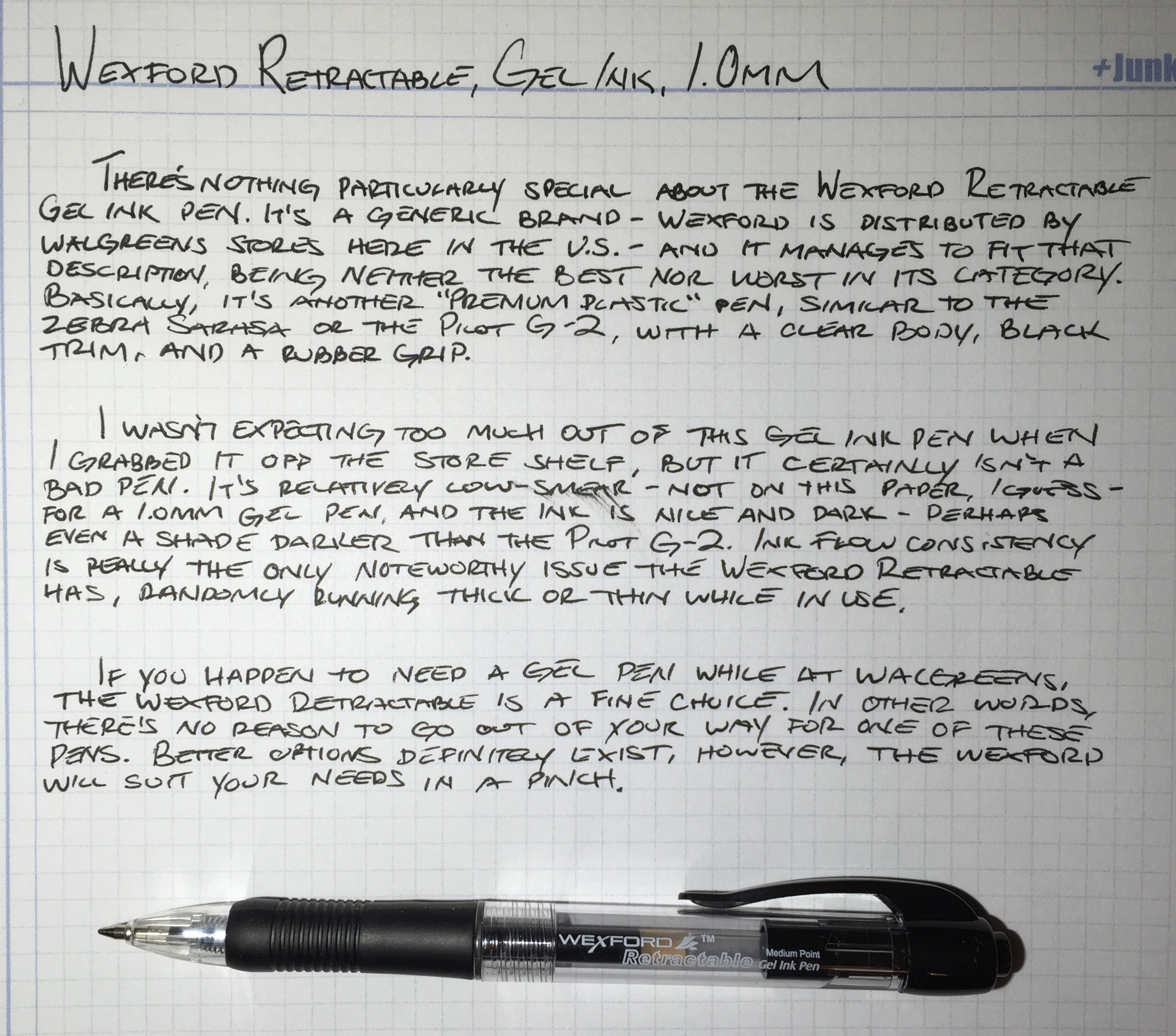 There’s nothing particularly special about the Wexford Retractable gel ink pen. It’s a generic brand – Wexford is distributed by Walgreens stores here in the U.S. – and it manages to fit a “generic” description, being neither the best nor worst in its category. Basically, it’s a another “premium plastic” pen, similar to the Pilot G-2 or Zebra Sarasa, with a clear body, black trim, and a rubber grip.