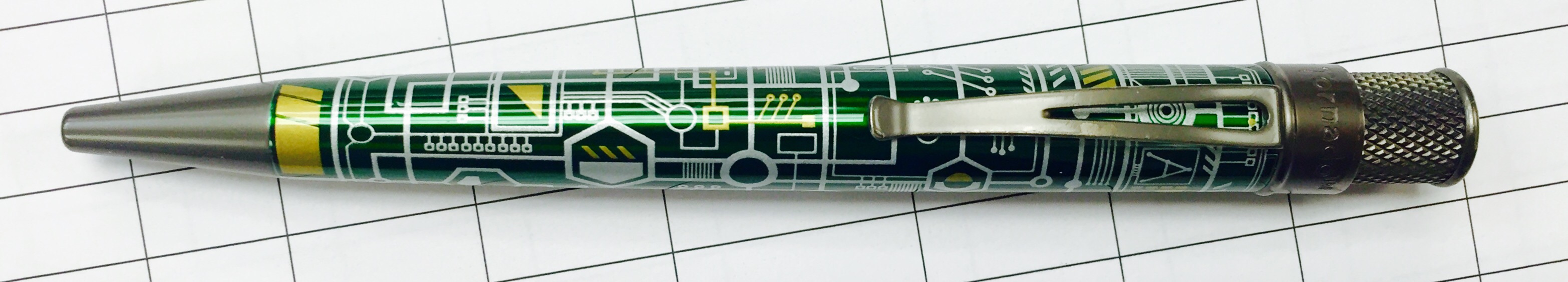 Limited to 500 pieces and sold only through Anderson Pens, the Terabyte Tornado is wrapped with a circuit-board design, and its metallic bits – the tip, clip, and twist – are given a dark, matted finish that is reminiscent of solder alloy. There’s also a dark green disk inset into the top of the twist, which adds a nice accent. Careful, though – after accidentally dropping the pen, the disk popped right out (but a little Krazy glue quickly fixed it).