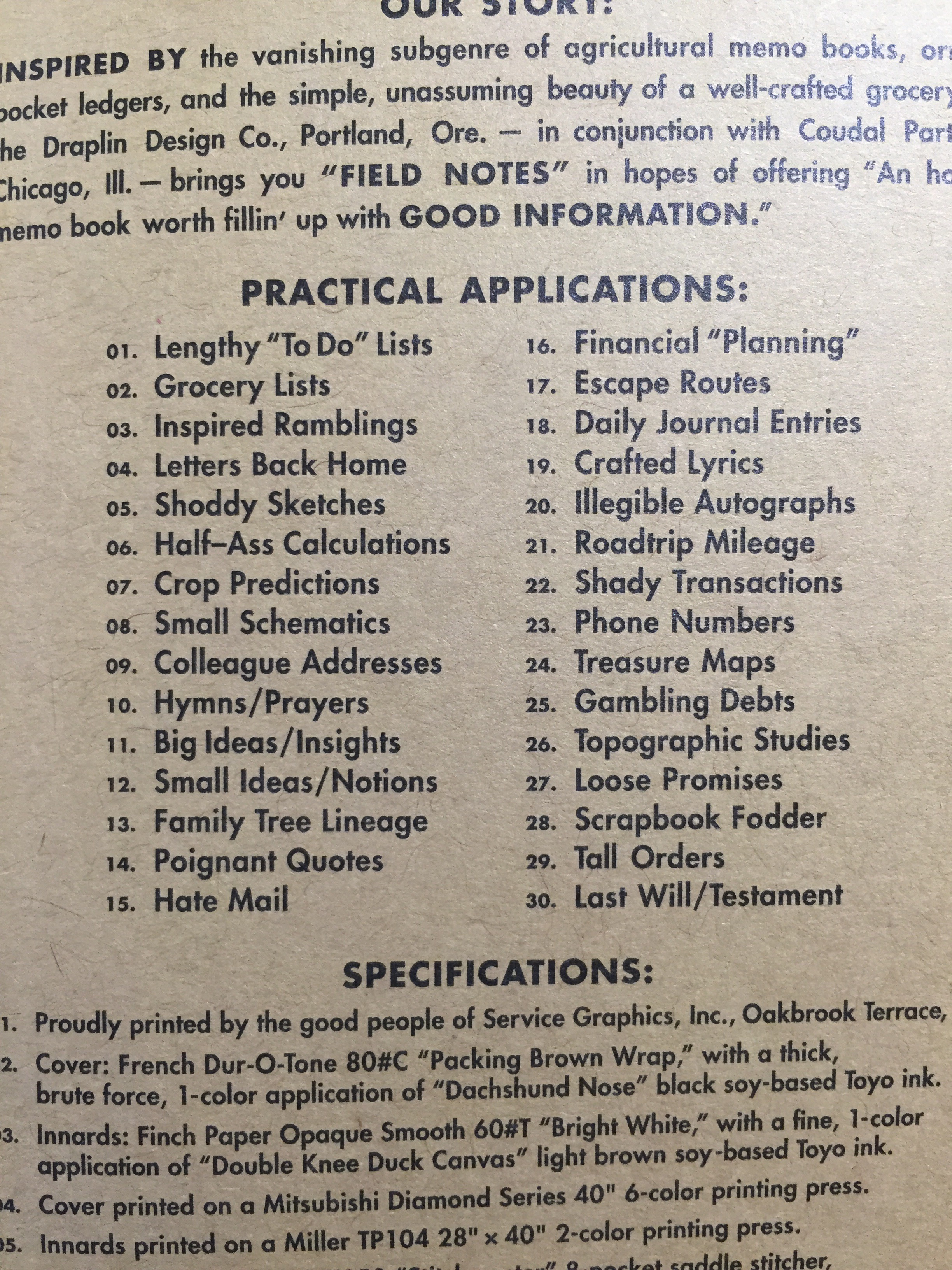 Where the traditional Field Notes pocket notebook is great for keeping lists or taking down shorter bits of information, the Byline edition is much better when longer notes are required. The obvious application is for in-the-field interviews, as Byline slips nicely into a jacket’s vest pocket, but I found that it works great for things like writing out book references or keeping notes for movie reviews. I tested out that latter use case, taking notes for brief movie reviews (which I’ve published on Rotten Tomatoes).
