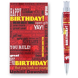 The ‘Birthday Greeting’ series was made with three different colors/designs: blue (shown above), yellow (shown below), and red (shown here). Apart from the colors, the red and yellow pens are identical. They have phrases and icons pictured all over the barrel, and the word “BIRTHDAY!” is splashed across the side. The blue version is subtler, and it mainly consists of numbers/ages. The blue design still contains an assortment of birthday-ish words and icons, but you’d really need to examine it in order to see the theme.