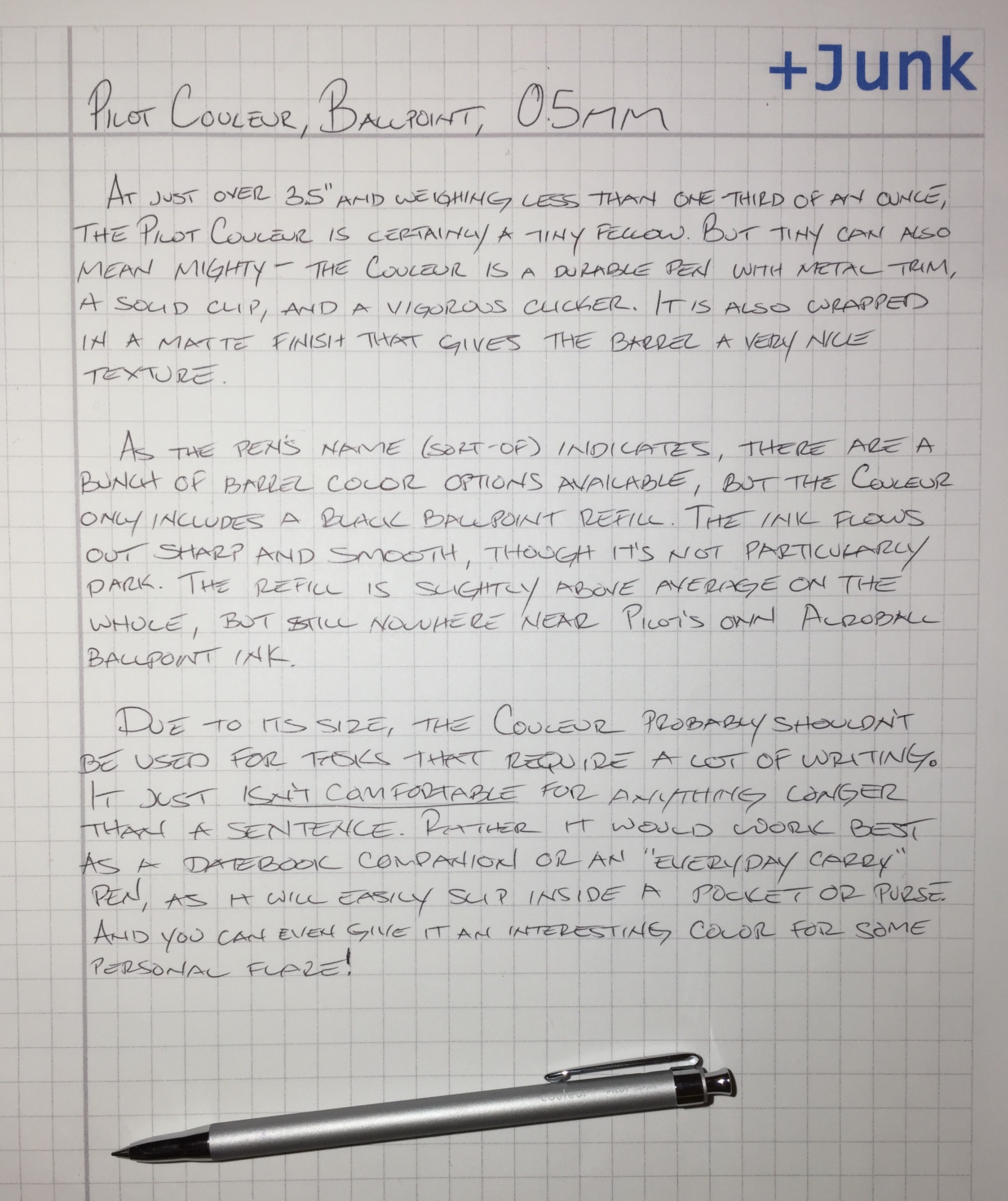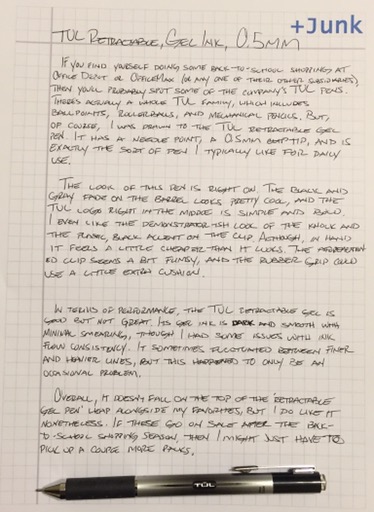 Since the AmazonBasics gel so much less expensive than its competitors, I’d expected a sharp decrease in quality, but everything has worked well for me over the last month that I’ve been using these pens. They write clean with low smearing, the ink is dark, and the grip section is comfortable to hold. I’ve had no issues with ink leaking, the knock hasn’t jammed, and the plastic clip has so far resisted snapping off.