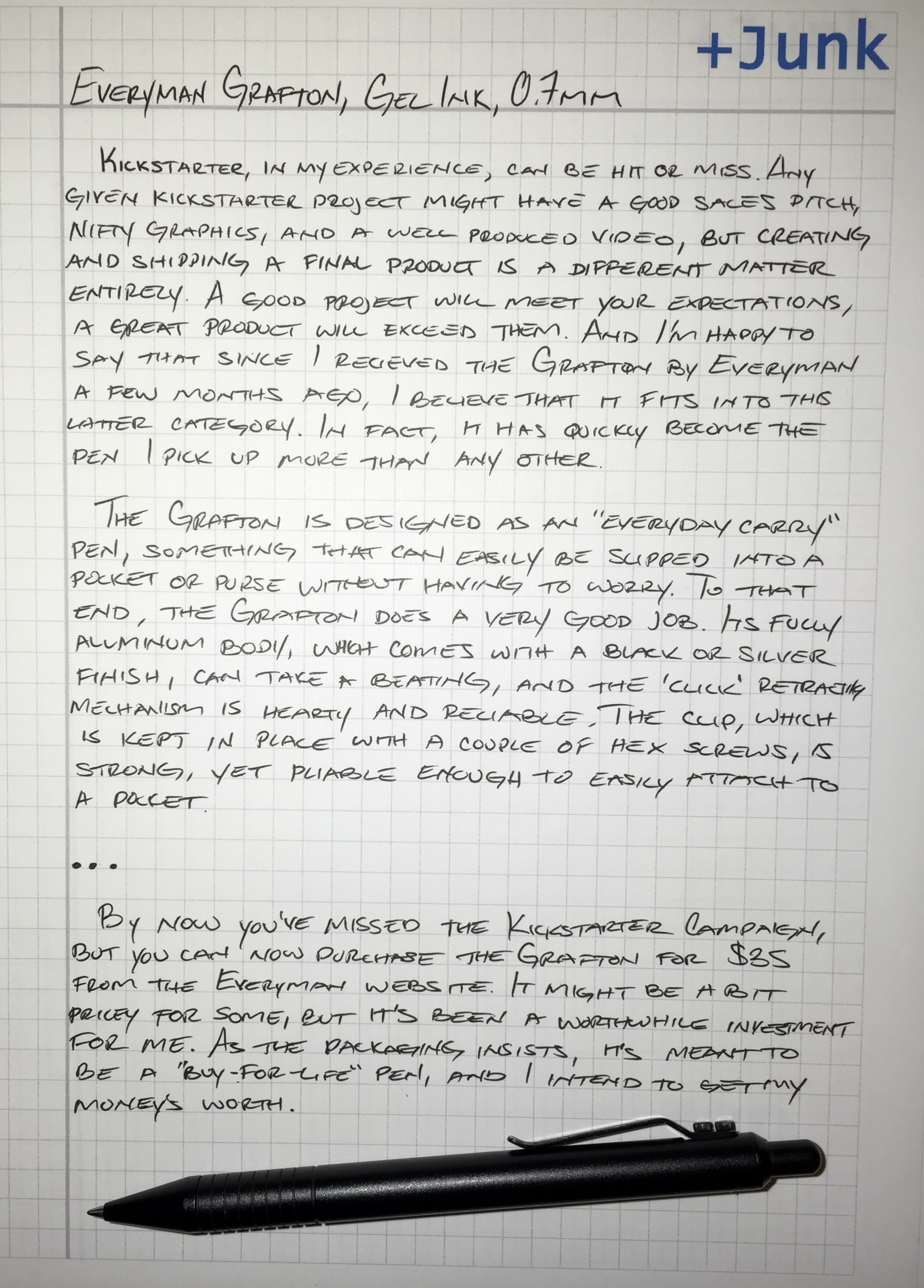 If you’re interested in the Grafton, you’ve unfortunately missed the Kickstarter campaign. However, you can now purchase one from the Everyman website for a little more money – $35. It might be a tad pricey for some, but it’s been a worthwhile investment for me. As the packaging insists, it’s meant to be a “Buy-For-Life” pen, so I intend to get my money’s worth.